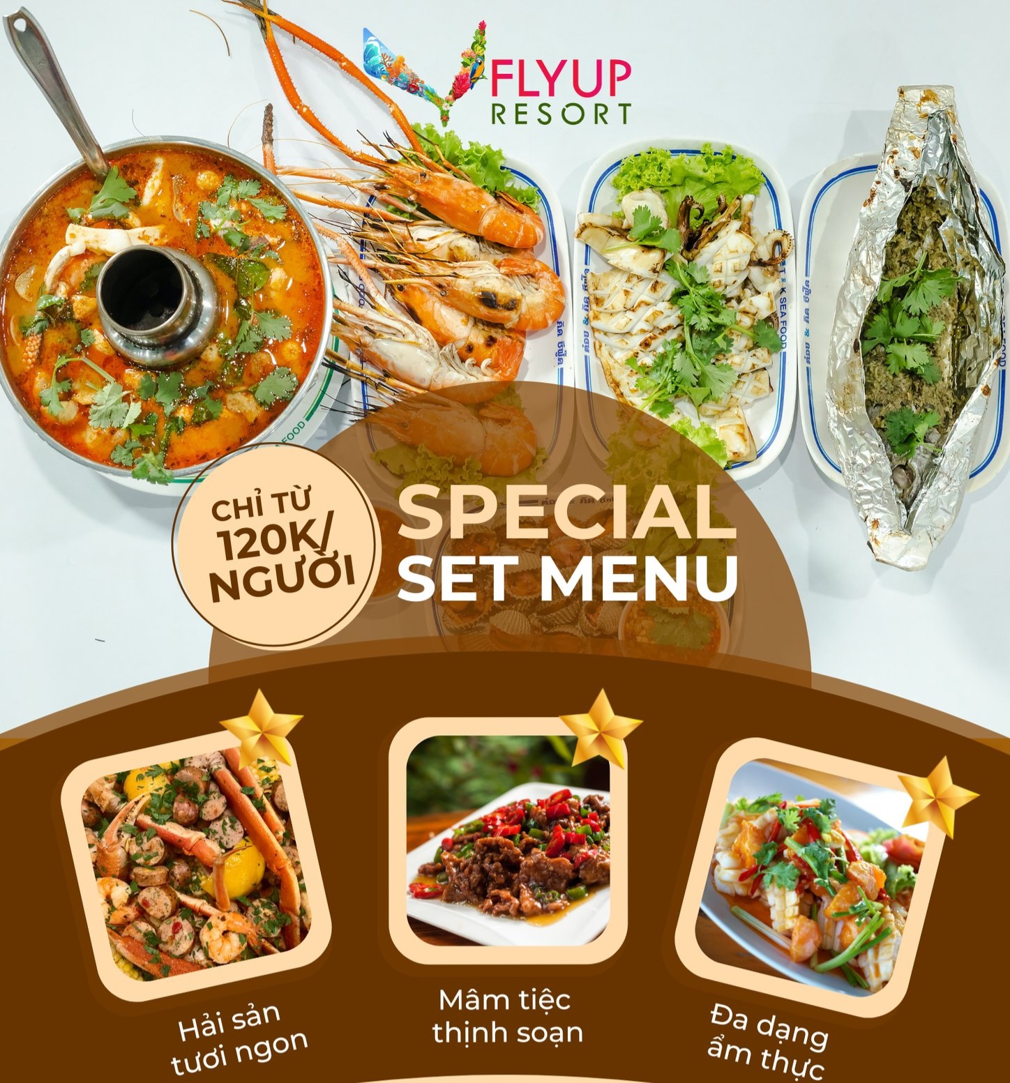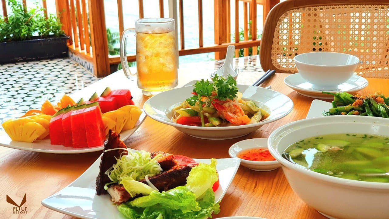 Nhà hàng của Fly Up Resort có thực đơn phong phú với các món ăn ngon và đa dạng từ hải sản tươi ngon đến các món đặc sản độc đáo. Bữa ăn tại đây là một trải nghiệm ẩm thực độc đáo.