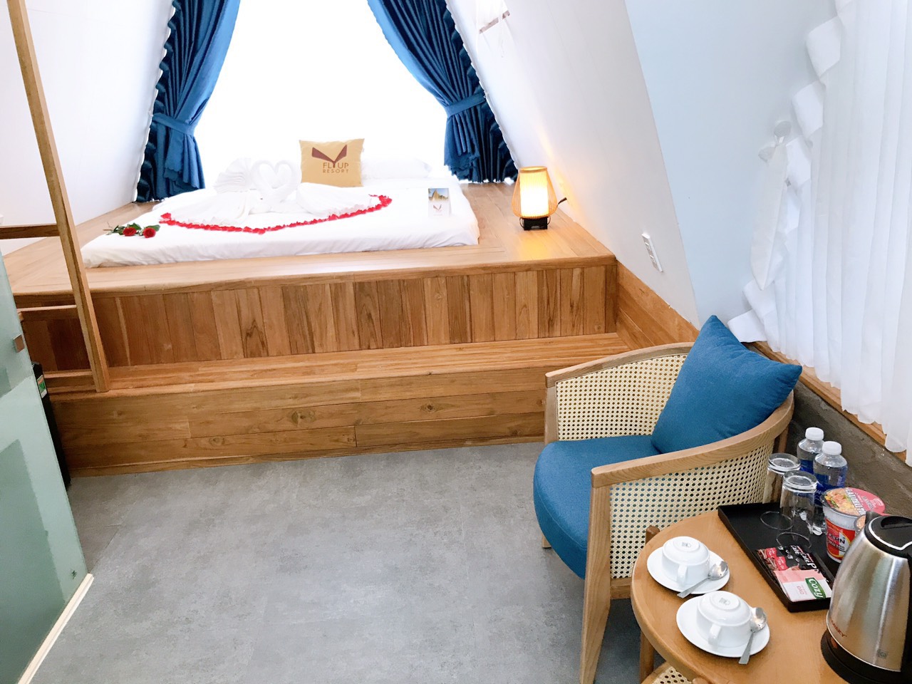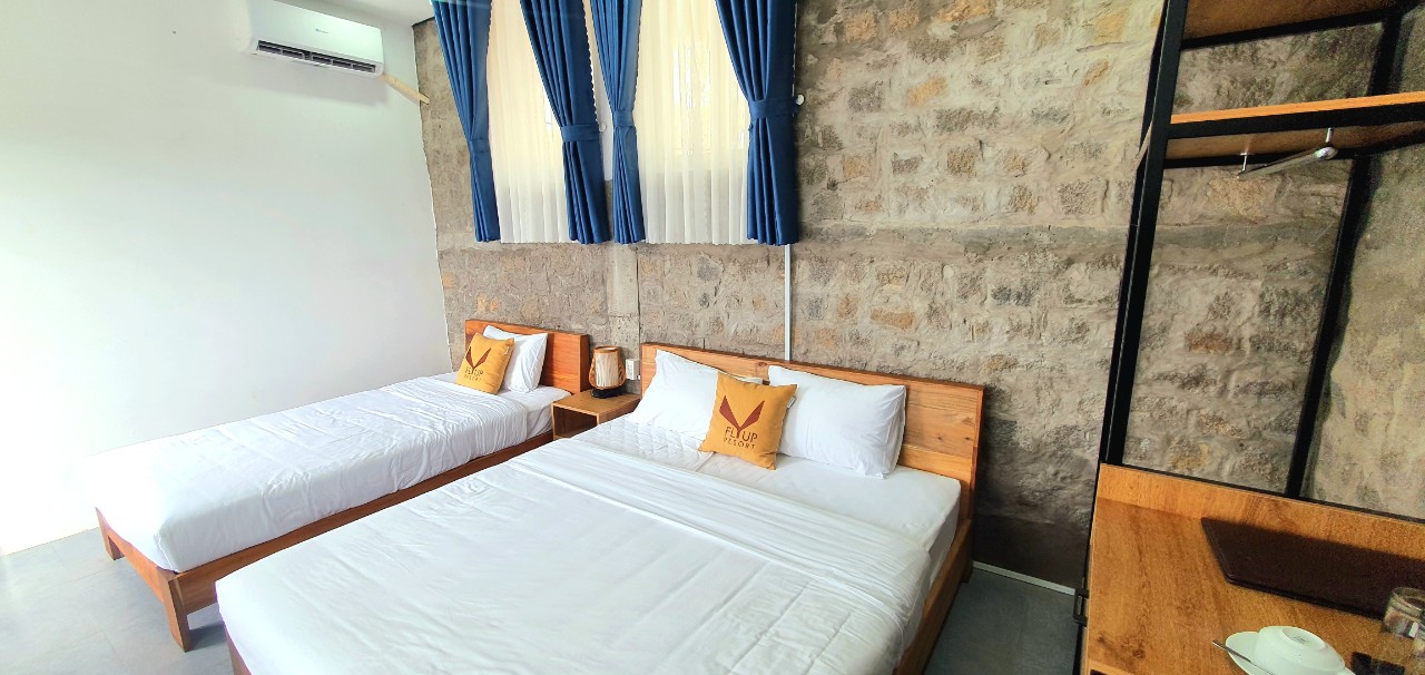 - Phòng gia đình cao cấp có giá 3.400.000 VNĐ/ đêm, dành cho 4 người lớn / 2 trẻ em. Bạn cũng có thể lựa chọn các gói ưu đãi khác khi đặt phòng trước tại Fly Up Resort.