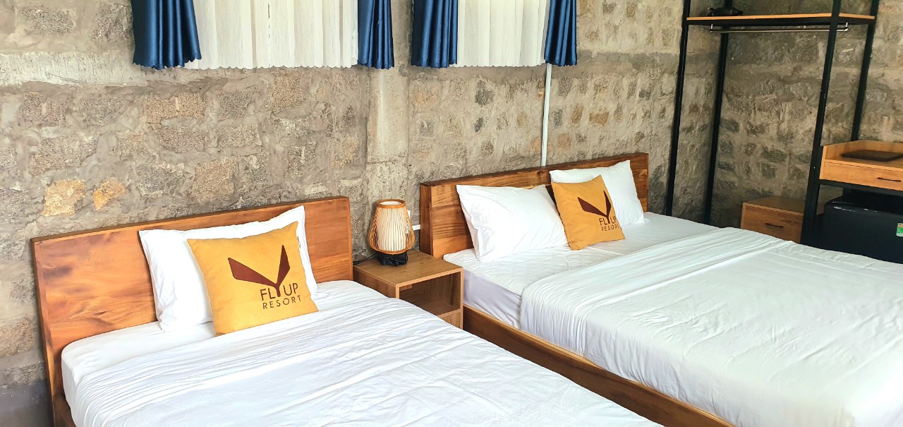 - Phòng view sân vườn có giá 1.500.000 VNĐ/ đêm, giường Twins Bed và dành cho 2 người lớn / 1 trẻ em. Bạn cũng có thể lựa chọn các gói ưu đãi khác khi đặt phòng trước tại Fly Up Resort.